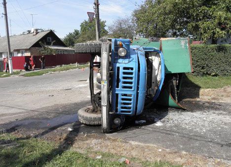 За попередніми даними, водій вантажного автомобіля "ЗІЛ-431410", рухаючись по другорядній дорозі, не надав перевагу в русі та скоїв зіткнення з автобусом "Богдан", після чого перекинувся на лівий бік.