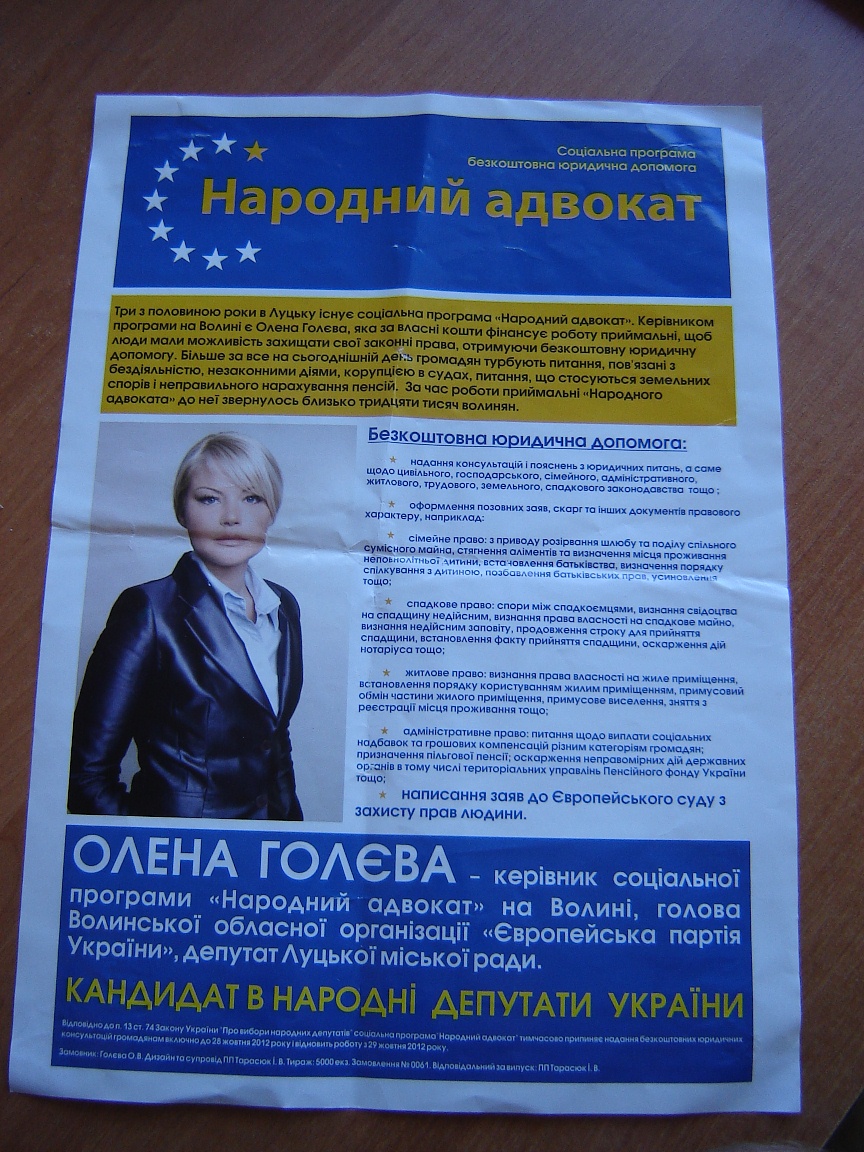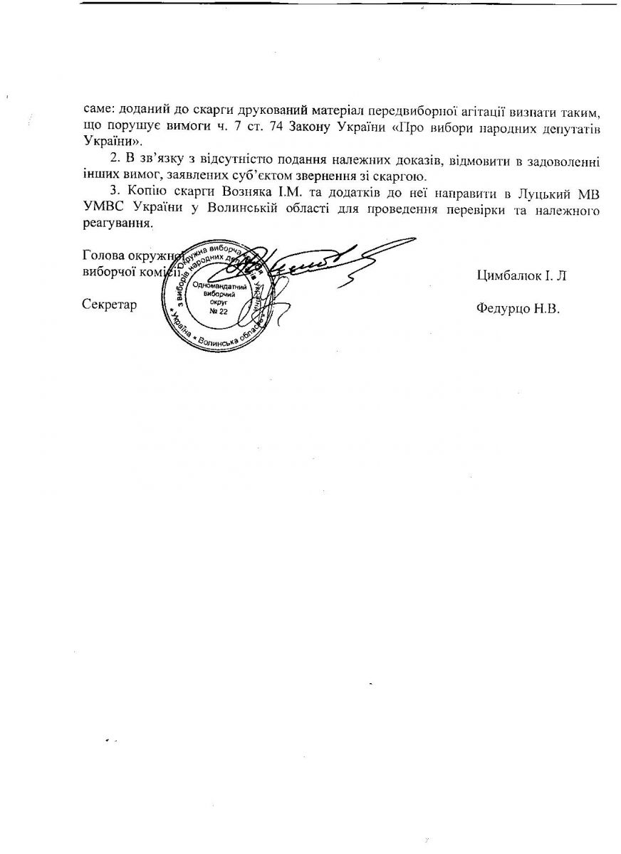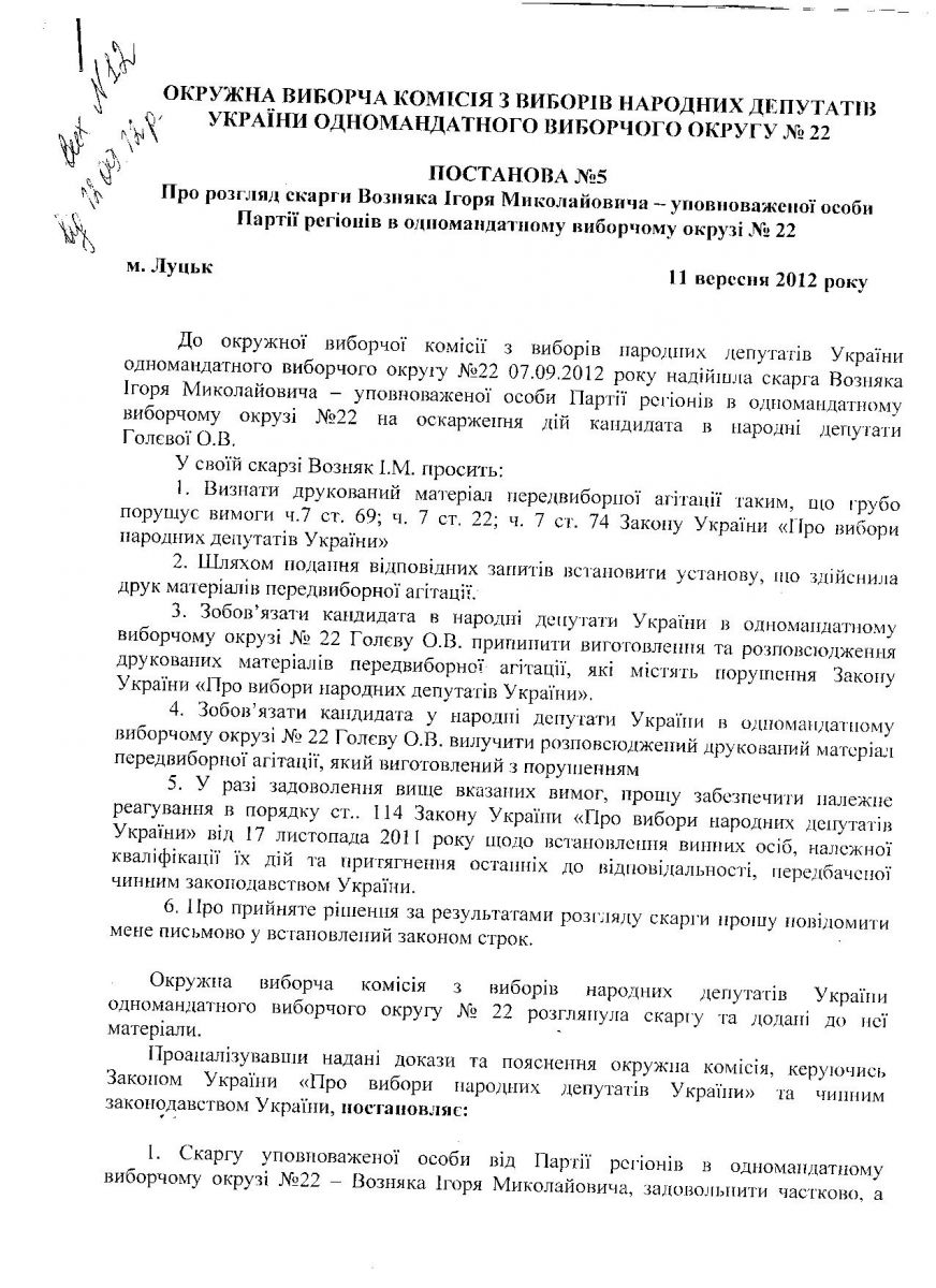 В тексті постанови ОВК сказано, що вимоги скаржника задоволено частково. Зокрема, ОВК визнала агітаційну листівку Олени Голєвої такою, що порушує ч. 7 ст. 74 Закону України «Про вибори народних депутатів України». При тому, що Волинський окружний адміністративний суд, який розглядав схожу справу щодо визнання листівок кандидата Голєвої порушенням, був іншої думки та відмовив в задоволенні адміністративного позову кандидата від партії «УДАР».