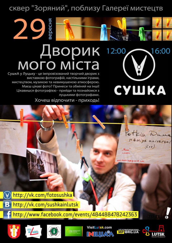 29 вересня у одному з двориків вул. Лесі Українки відбудеться виставка фотографій «Дворик мого міста» у форматі «сушки». Фотомитці матимуть нагоду презентувати свою творчість у незвичному форматі, а також обміняти свої світлини на роботи інших учасників. Протягом виставки буде створено імпровізований дворик, у якому можна буде пограти у настільні ігри, послухати музику та просто відпочити від міської метушні. Виставка триватиме від 12 до 16 години.