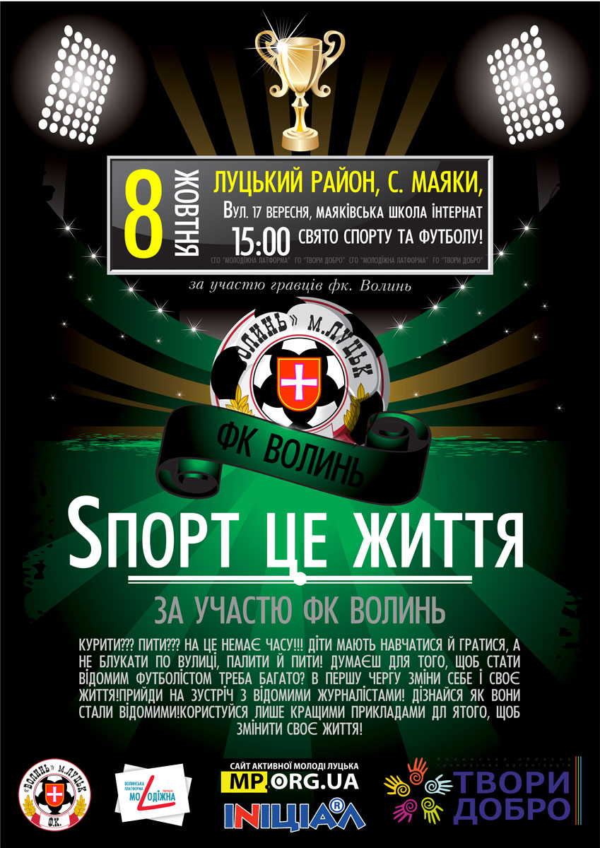 Спеціально для любителів футболу та здоров’я ВОГО «Твори добро» спільно з ФК «Волинь», та за підтримки СГО «Молодіжна платформа» організовують спортивне свято «Спорт – це життя».