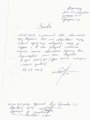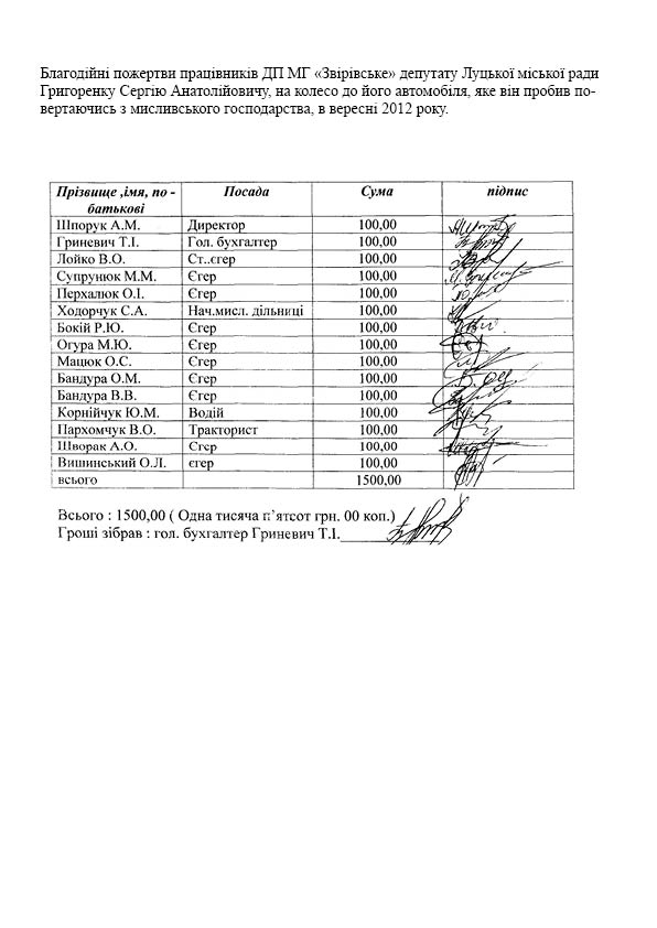 Як не парадоксально, але Сергій Анатолійович вважає, що саме працівники мисливського господарства мають компенсувати йому вартість спущеного колеса. І суму виставив - 1450 грн. Зауважте, у заяві навіть не говориться, якої марки була машина, яку шину планує купити пан Григоренко. Не підшитий чек про те, що саме таку суму він сплатив за колесо. Як йдеться у повідомленні прес-служб обласного управління лісового та мисливського господарства, аби не чути крики і погрози депутата, працівники Звірівського МГ вирішили скинутися і зібрати відповідну суму (лист із підписами про благодійні пожертви надсилаю також). Пан Григоренко прийняв кошти і на заяві зауважив, що тепер претензій не має.