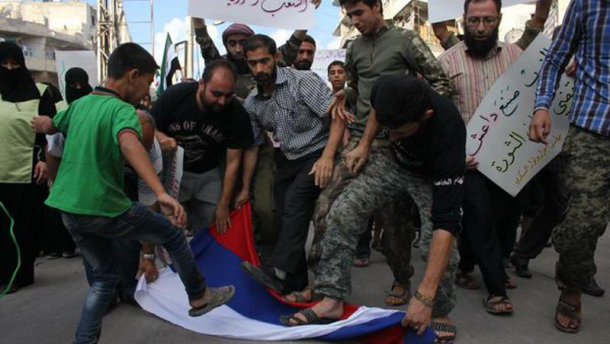 Під час акції протесту в сирійському місті Алеппо демонстранти розтоптали російський триколор.
