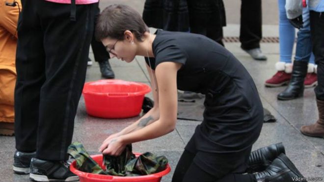 «Учасниці принесли воду з річки Мойки, зняли камуфляжний одяг без розпізнавальних знаків — який була забруднений кров'ю [...] і стали його прати. Після акції одяг повісили на огорожі Невського проспекту. Після цього учасниці були затримані поліцією», — описує перформанс в своєму «Фейсбуці» історик Вадим Лур'є.