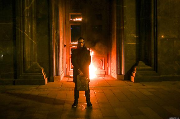 На кадрах видно, як Павленський позує перед першим під'їздом будівлі ФСБ на Луб'янці, а позаду нього горять вхідні двері.