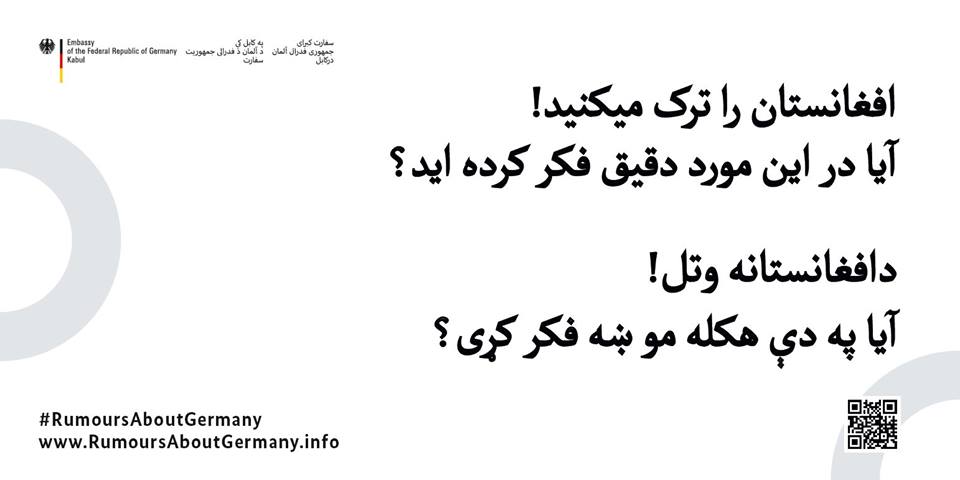 Оголошення на мовах даруй і пушту попереджають, що контрабандисти, які провозять біженців в Європу, не зацікавлені в їхньому благополуччі та готові піддати їхнє життя небезпеці. «Не вірте чуткам і хибним відомостями, які поширюють контрабандисти про легку подорож і легке життя в Німеччині, -- йдеться в одному з постів на сторінці посольства у Facebook. -- Не піддавайте своє життя небезпеці по дорозі до Європи ».