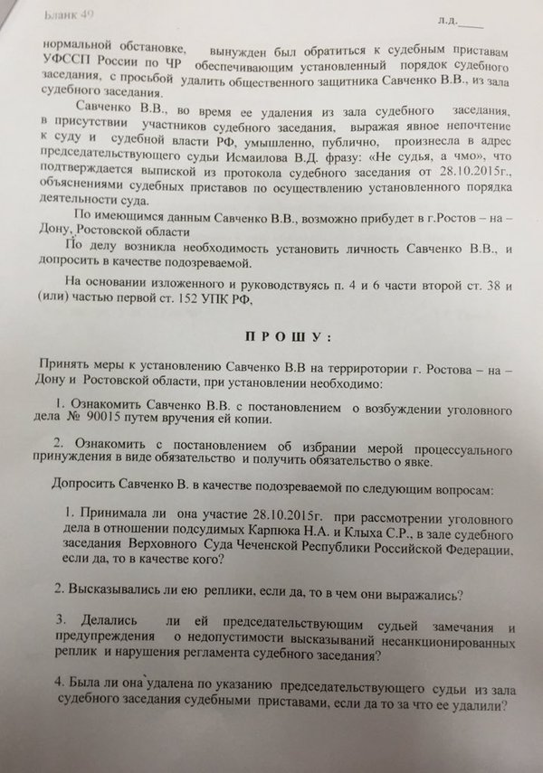 Справу порушено після того, як 28 жовтня Віра Савченко побувала на судовому процесі над українськими громадянами Миколою Карпюком і Станіславом Клихом, яких звинувачують в участі у чеченській війні на боці бойовиків. Їy.. справу розглядає Верховний суд Чечні.