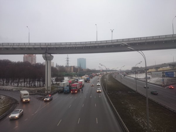 На фотографії, який виклав в Twitter кореспондент BBC Павло Аксьонов, машини зайняли чотири ряди на зовнішній стороні кільцевої автодороги від перетину з Ленінградським шосе і далі на схід. Вільної для руху, за його словами, залишилася лише одна смуга, повідомляє «РБК».
