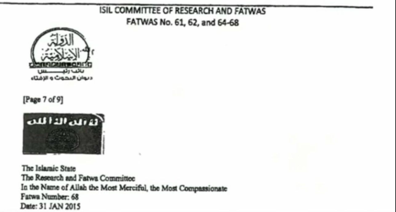 Захоплений масив документів показує, як керівництво «ІД» підводить законне обгрунтування для дій організації, які можна вважати злочинами. Так, за відомостями Reuters, серед документів також є «Фетва № 64», в якій описуються докладні правила можливого згвалтування захоплених в полон жінок.