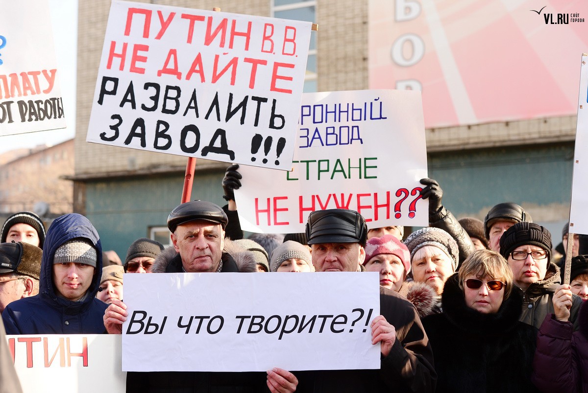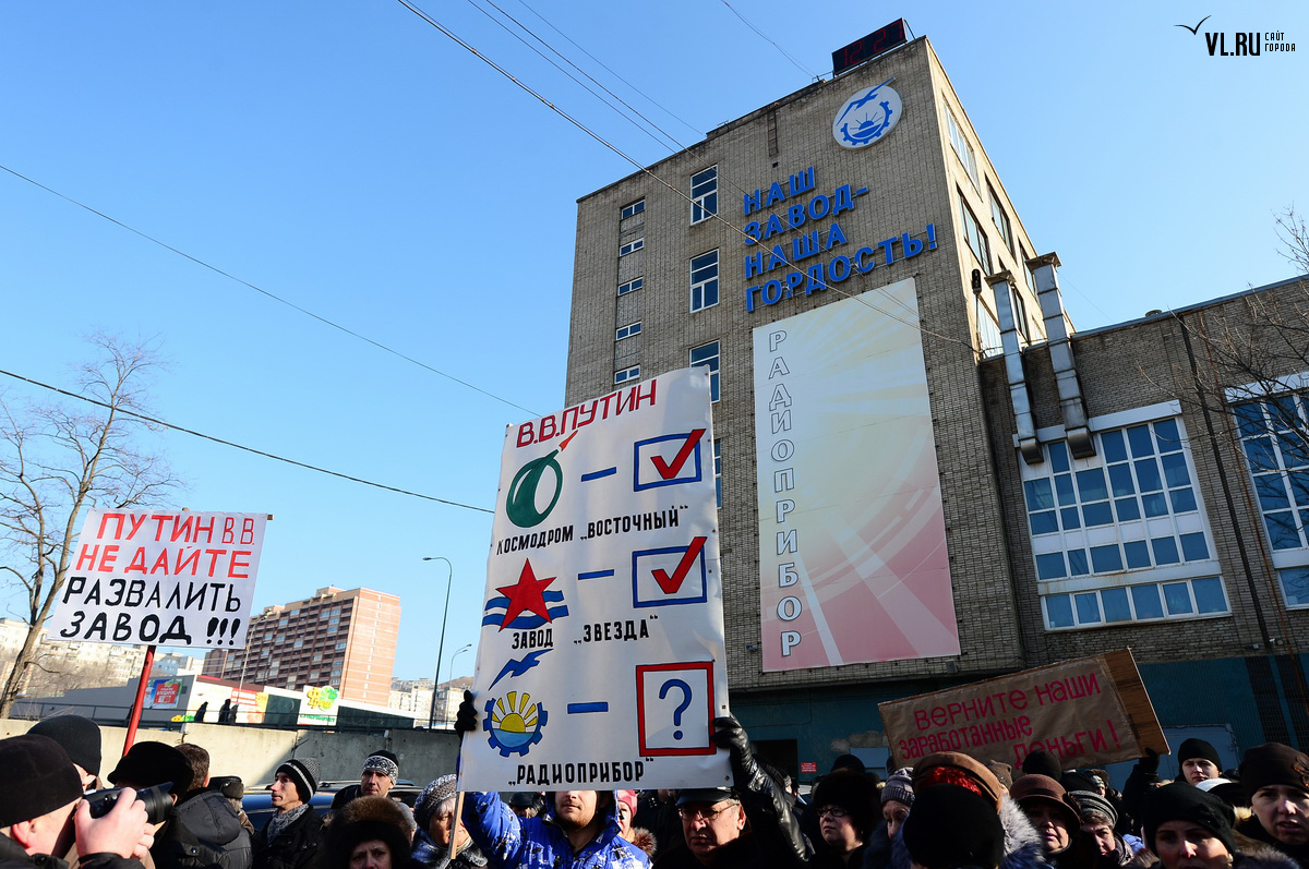 Працівники владивостокського «Радиоприбора» звернулися до Путіна з проханнями не допустити розвалу заводу. Люди, які не одержують зарплату місяцями, написали свої вимоги до Президента на плакатах під час мітингу, який відбувся на території підприємства в п’ятницю, 25 грудня. Причини фінансових складнощів гендиректор вийшов пояснити журналістам, бо мітингувальники його освистали, повідомляє сайт VL.ru.