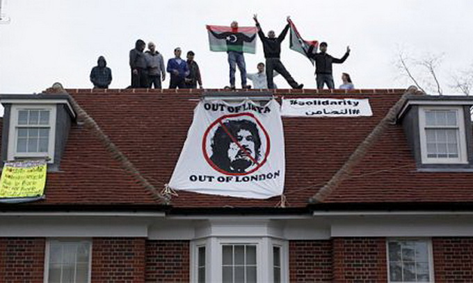 На даху будинку вартістю 11 мільйонів доларів «загарбники-скватери» почепили плакат із гаслом «Геть із Лівії, геть із Лондона».