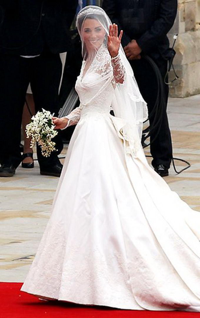 Кейт Міддлтон стояла перед вівтарем у білій весільній сукні з довгими мереживними рукавами, яку для неї зшили в будинку моди Олександра Маккуїна. За дизайн плаття відповідала нинішня глава будинку Сара Бартон. Принц Вільям одягнений у червоний мундир полковника Ірландської гвардії.