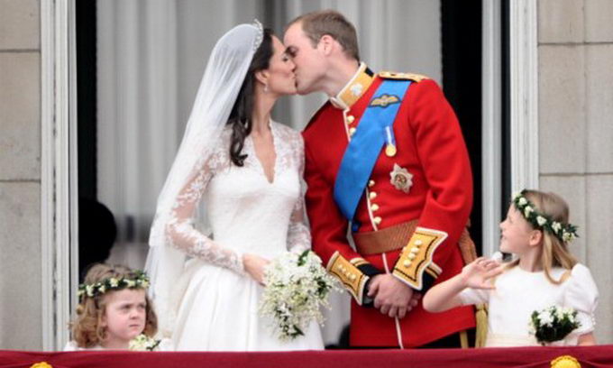 Молодята, згідно з регламентом, після вінчання та шлюбної церемонії з'явилися на балконі Букінгемського палацу. Вони трохи потримали публіку в напрузі, посміхаючись і махаючи руками, і потім поцілувалися.