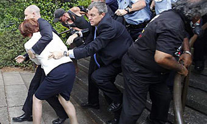 Для евакуації прем’єр-міністра й лідера опозиції до ресторану прибули близько 50 співробітників поліції, включаючи загін спецназу. Протягом 20 хвилин політики таки змогли благополучно покинути заклад і сісти в машину. Демонстранти не заспокоїлися й стали переслідувати авто прем’єра, б’ючи по даху й капоту.