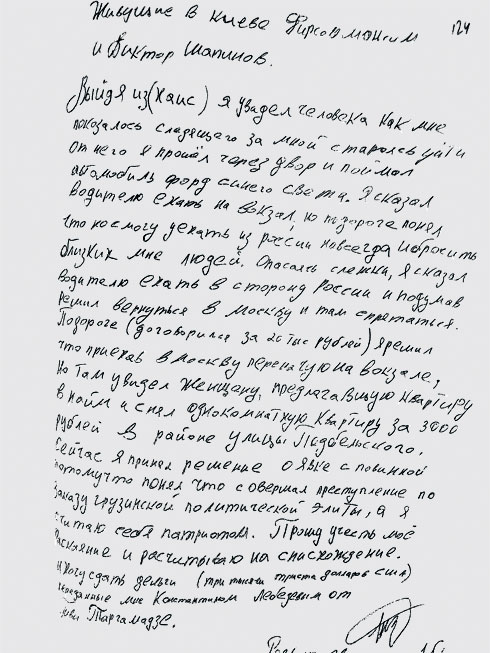 «Я прийняв рішення про явку з повинною, бо зрозумів, що скоїв злочин на замовлення грузинської політичної еліти, а я вважаю себе патріотом. Прошу врахувати моє каяття і розраховую на поблажливість», — написав Развозжаєв.