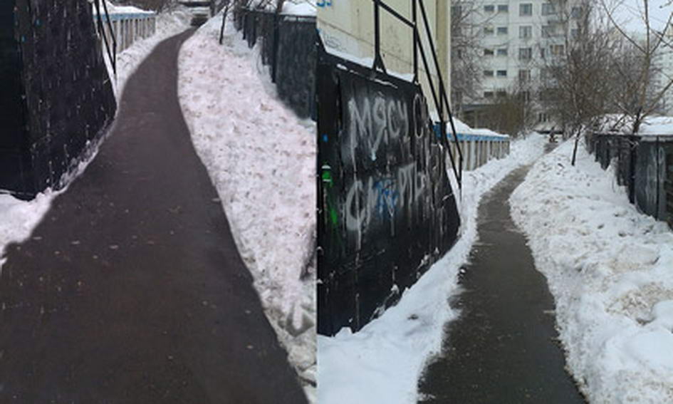 Юрій Урсу звернув увагу на те, що на знімку видно сліди ретуші. Він у той же день сфотографував доріжку, яка виявилася очищеною від снігу, але не такою рівною, як на знімку управи. Крім того, у фотографії, опублікованій на gorod.mos.ru, був зафарбований напис «М'ясу смерть!» на сходах, що потрапили в кадр.