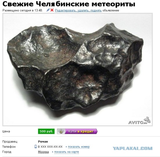 Один із таких «свіженьких ранкових метеоритів» продає якийсь Олексій із Магнітогорська всього за 500 рублів: «Продаю, бо мені самому не потрібний. На ньому є невеликі потертості, але в цілому все відмінно. Частина в атмосфері згоріла».