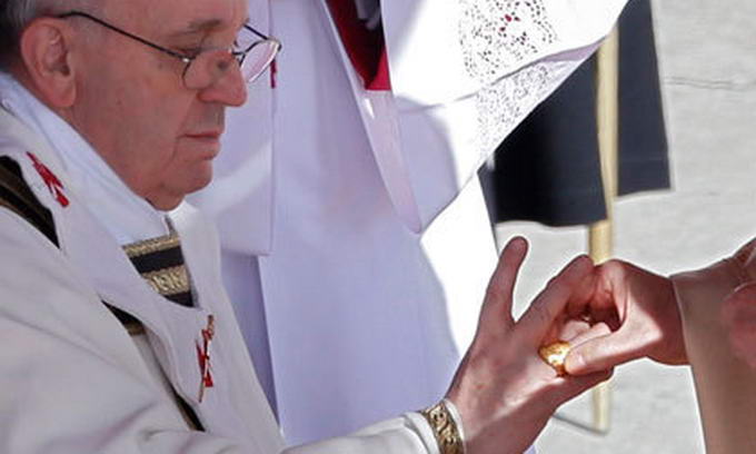 Папа Римськи Франциск отримав символи верховної влади Римського понтифіка — так званий «перстень Рибака» та омофор (pallio) під час урочистої інавгураційної меси, яка проходить на площі св. Петра.