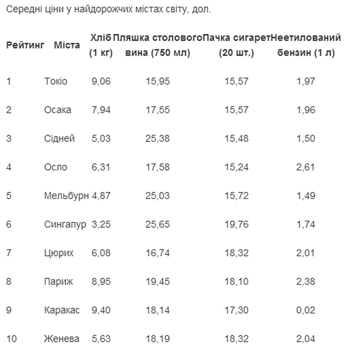 Дослідники брали до уваги ціни на 160 товарів і послуг у 131 місті. Основою рейтингу є вартість життя у Нью-Йорку, для якого індекс дорівнює 100. Для Токіо цей показник дорівнює 152, іншими словами, ціни у японській столиці вищі від нью-йоркських приблизно в 1,5 разу. Однак це американське місто займає лише 27-ме місце.
