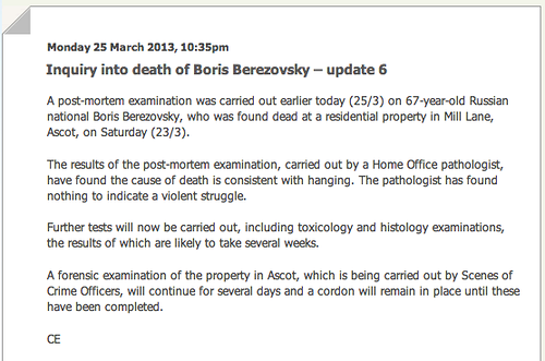 Журналісти зазначають, що в тексті поліцейського комюніке в якості причини смерті Березовського зазначено саме «повішання» (hanging), а не «удушення» (strangling).