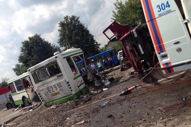 Аварія сталася о 12 годині за київським часом під Москвою. Рейсовий автобус, який прямував з Подольська в Курилове, зіткнувся з вантажівкою, яка перевозила щебінь. В результаті удару автобус розірвало на дві частини.