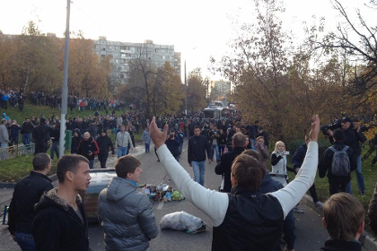 У московському районі Бірюльово вбили 25-річного місцевого жителя Єгора Щербакова. За наявною інформацією, в ніч на 10 жовтня Щербакова на очах його дівчини зарізав приїжджий неслов'янської зовнішності. В результаті увечері 12 жовтня біля будівлі місцевого відділу поліції зібрався перший «народний схід», передає «Кореспондент».