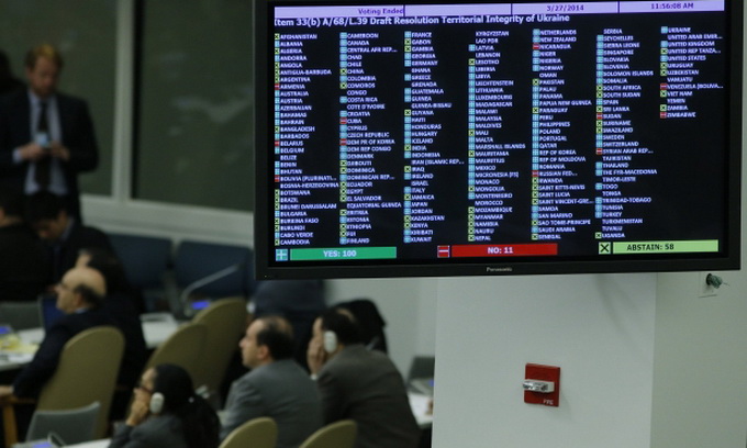 За відповідну резолюцію проголосували 100 країн-членів ООН. Проти проголосували 11 країн: разом з Росією проголосували лише Вірменія, Білорусь, Болівія, Куба, КНДР, Нікарагуа, Судан, Сирія, Зімбабве, Венесуела. Ще 58 країн, в тому числі Китай, утрималися.