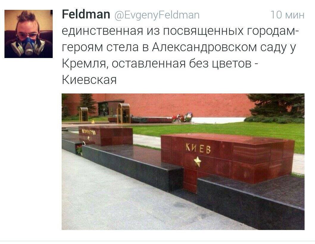 Однак згодом біля стели міста-героя Києва біля московського Кремля таки з’явилися квіти. Видно, їх принесли небайдужі москвичі.