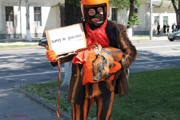 У столиці Молдови Кишиневі пройшла акція проти використання "георгіївської стрічки". До посольства Росії в республіці разом із поросям прийшов Анатол Метесару. Він був одягнений у пофарбований у кольори "колорадської" стрічки костюм, інформує тСН.