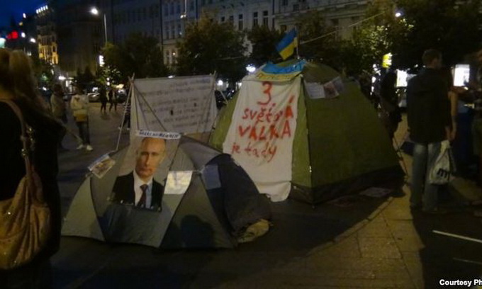 Три намети у центрі чеської столиці, на Вацлавській площі, з'явилися ввечері у неділю, 17 серпня. На них були українські прапори, фотографії президента Росії Володимира Путіна і написи «Стоп Путін», «Крим сьогодні, Карлові Вари завтра?», передає ТСН.