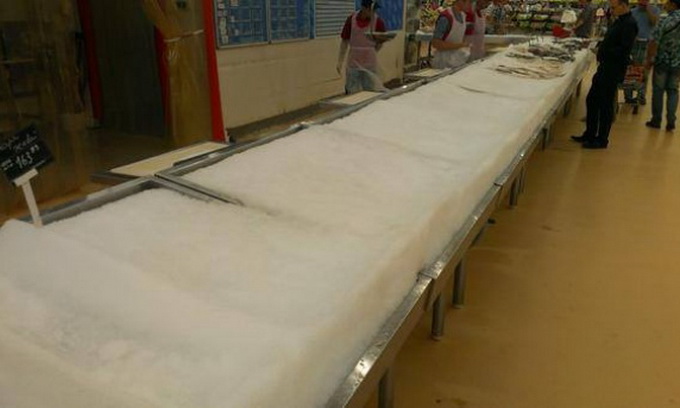Натомість російські інтернет-користувачі продовжують публікувати у соцмережах фото з напівпустими полицями магазинів. Зокрема, на світлинах у продуктових відділах немає риби та мало сирів.