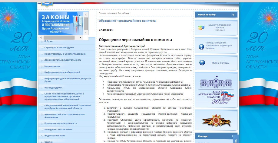 Вночі 7 жовтня на офіційному сайті Астраханської обласної думи з'явилося звернення, в якому повідомлялося про вихід регіону зі складу Російської Федерації.