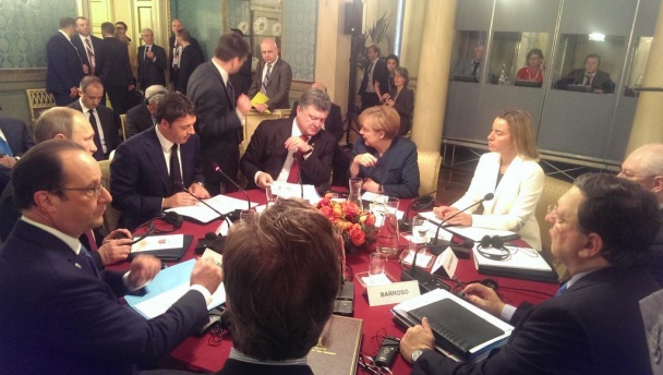 На зустрічі були присутні президент РФ В.Путін, міністр закордонних справ РФ С.Лавров, канцлер ФРН Ангела Меркель, президент Франції Ф.Олланд, очільник уряду Великобританії Д.Кемерон, голова Євроради Г-В..Ромпей голова Єврокомісії Ж.-М.Баррозу, очільник уряду Італії М.Ренці та високий представник з питань розширення та політики безпеки ЄС Ф.Могерині.