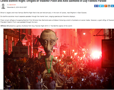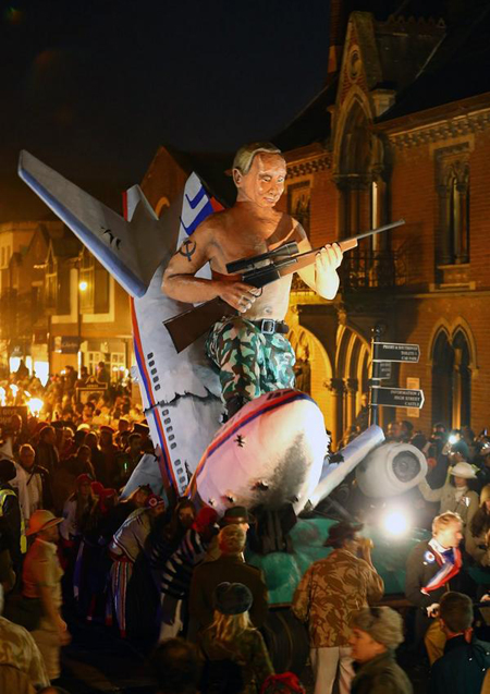 Учасники параду в ніч на 5 листопада провезли опудало Путіна, одягнене в зелене «тріко Бората». Несправжньому президенту Росії зв'язали руки й посадили на танк.